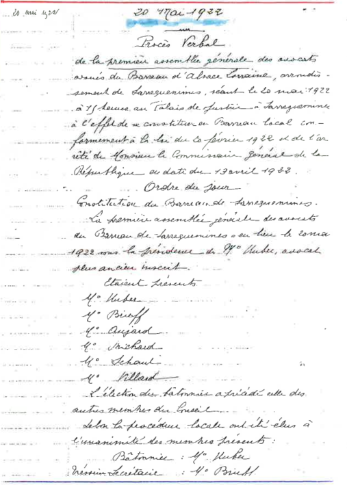 Le Barreau de Sarreguemines est officiellement fondé le 20 mai 1922, en application de la loi du 20 février 1922 et de l’arrêté du Commissaire Général de la République du 13 avril 1922.